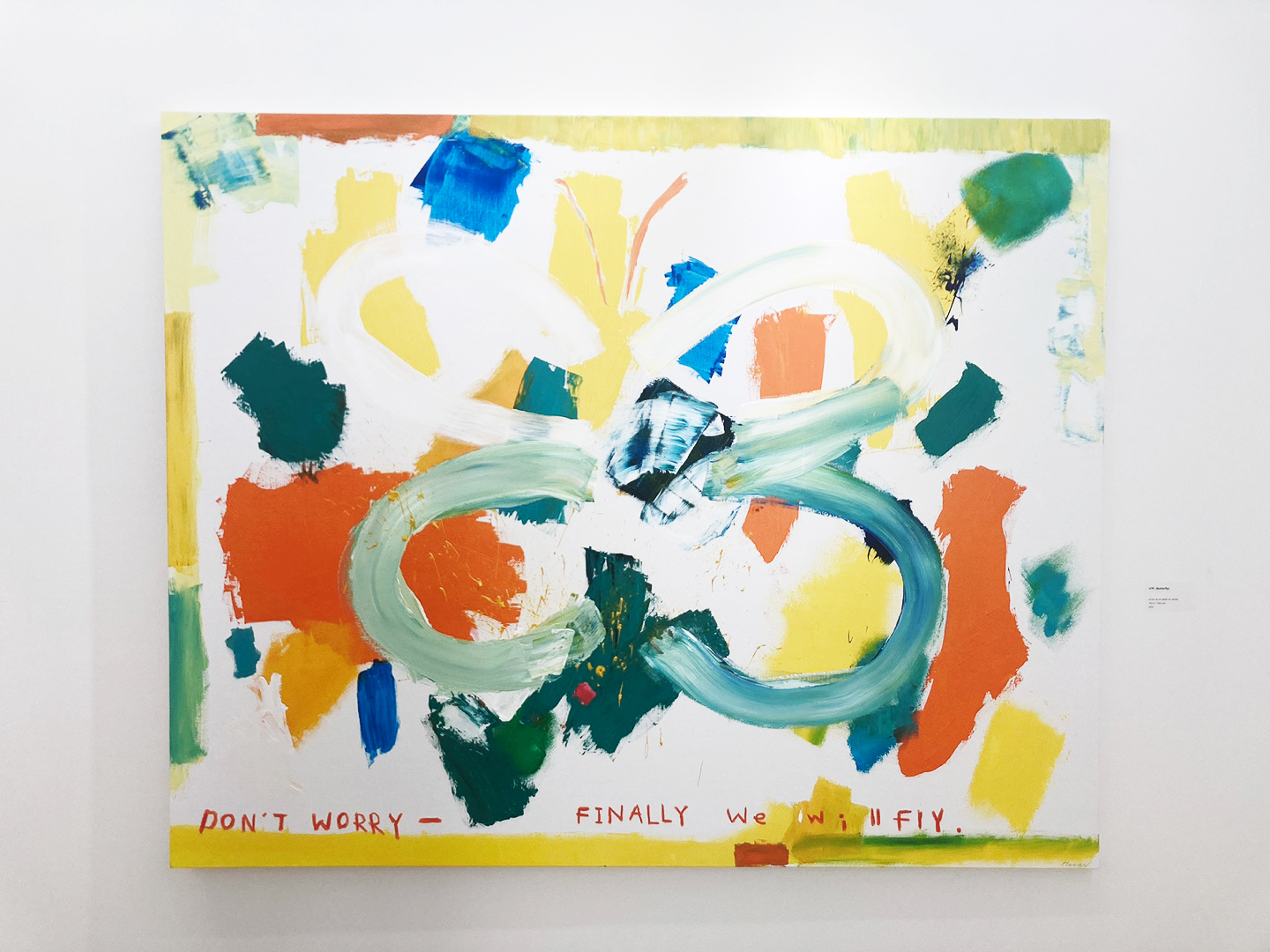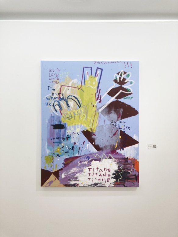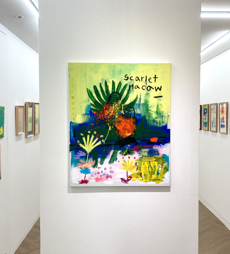 작가는 아크릴과 오일 파스텔, 마커, 스프레이, 페인팅 롤러, 스파츌라 등을 사용해 다양한 텍스처를 구현합니다. 부드러움과 선명함, 섬세함과 강함 등 서로 대비되는 특성을 붓 터치와 물감 뿌리기 등을 통해 한 화면에 자유롭게 표현합니다.