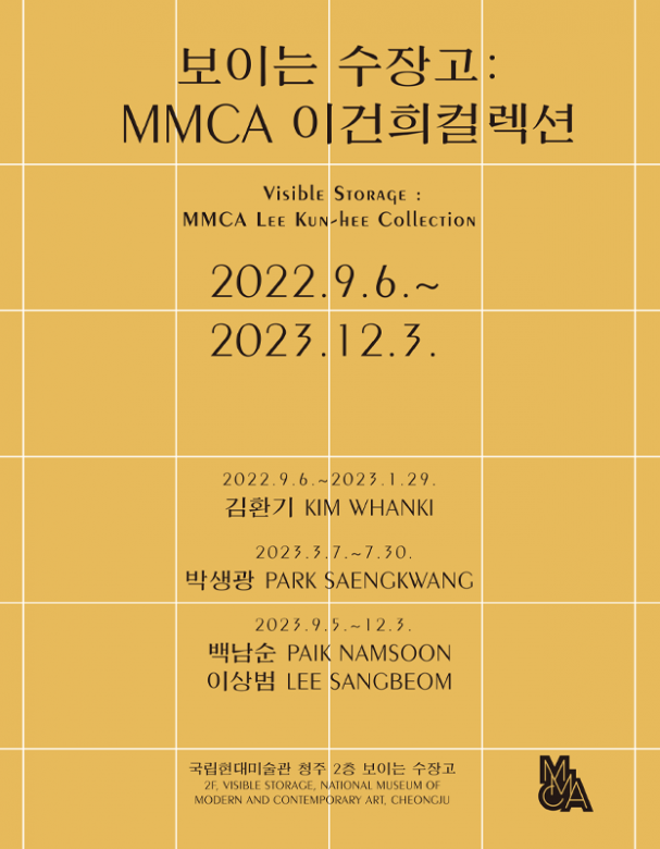 «보이는 수장고 : MMCA 이건희컬렉션»은 한국미술의 중심에 있는 작가들의 대표작을 2022년 9월 6일부터 2023년 12월 3일까지 총 3회에 걸쳐 소개합니다. 김환기의 ‹여인들과 항아리›(1950년대), 박생광의 ‹무속›(1980), 백남순의 ‹낙원›(1936년경), 이상범의 ‹무릉도원›(1922) 등은 모두 미술사적 가치를 지닌 이건희컬렉션의 주요 작품입니다. ‘모두가 볼 수 있는’ 열린 형태의 수장고인 ‘보이는 수장고’에서‘MMCA 이건희컬렉션’이 선사하는 색다른 감동을 느껴보시기 바랍니다. / 국립현대미술관