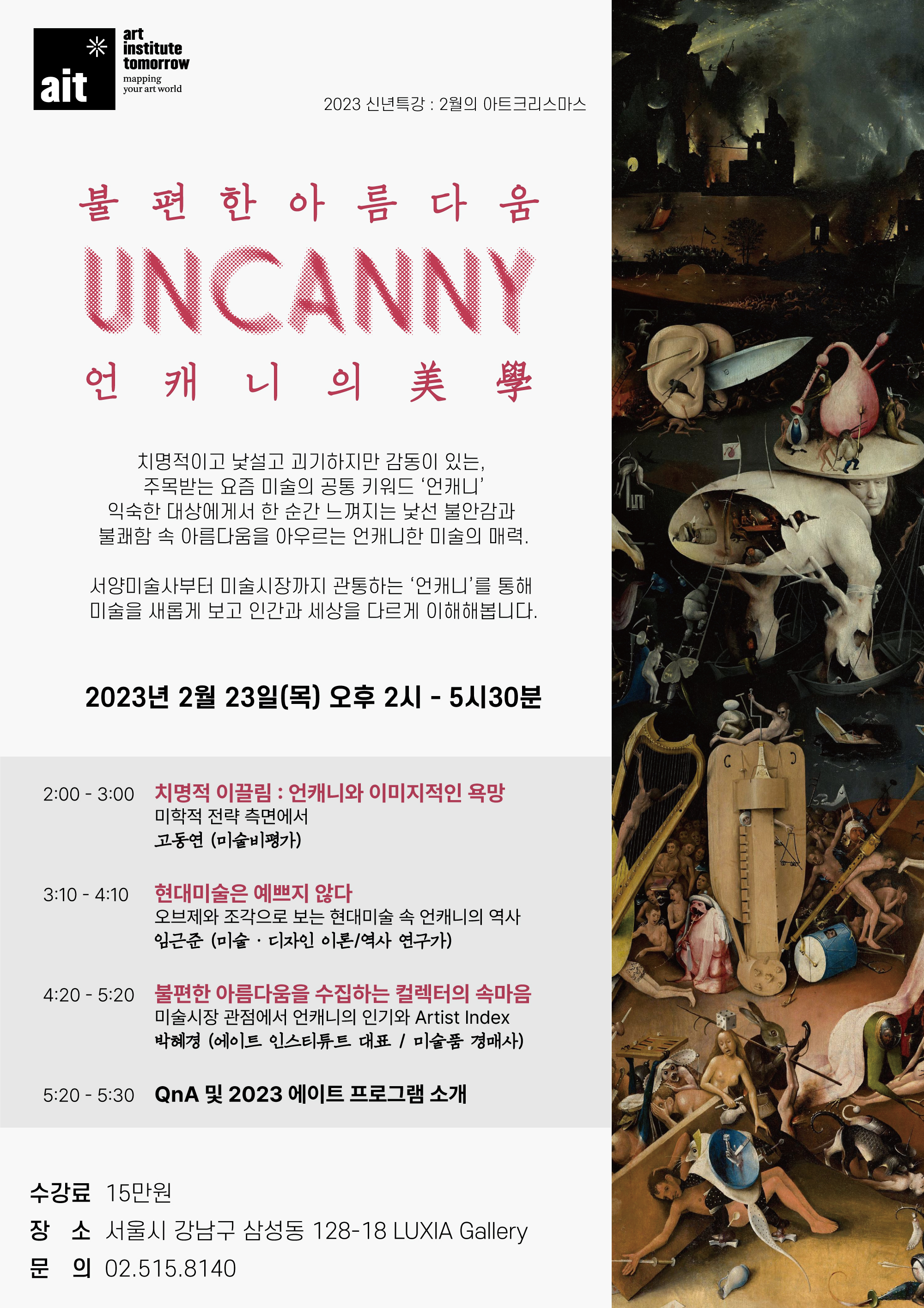 매년 그 해의 미술 트렌드를 관통하는 주제로 특강을 이어오고 있는 에이트 인스티튜트의 신년 현대미술 특강 "2월의 아트크리스마스"가 올해는 2023년 2월 23일 <불편한 아름다움 : 언캐니의 미학>으로 찾아옵니다!