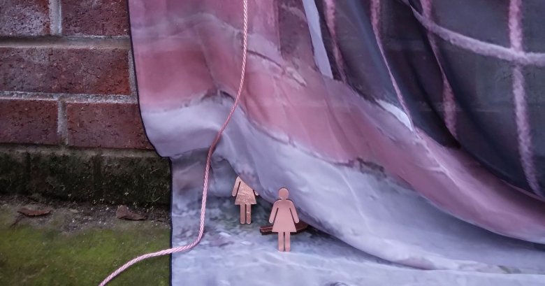 need access to public facilities in which to wash, sex workers, migrants, the list goes on. The installation 'Inconvenient Bodies' develops ideas and material processes worked with previously. Three chiffon panels printed with images of women’s public toilets in very poor condition are supported on a line of pink satin rope by six wooden washing line props, sanded and waxed to a high finish, like modernist designer furniture. A hoard of small copper coated plywood cut-outs of ‘ladies’ also inhabit the gallery space, these little objects could be easily overlooked, like those with bodies deemed inconvenient by society and culture.